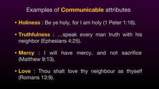 That God does not share or communicate to others and the communicable attributes of God those God shares or communicates with us. In the present chapter the following perfections of God come into consideration. So well only introduce a few of those attributes here.